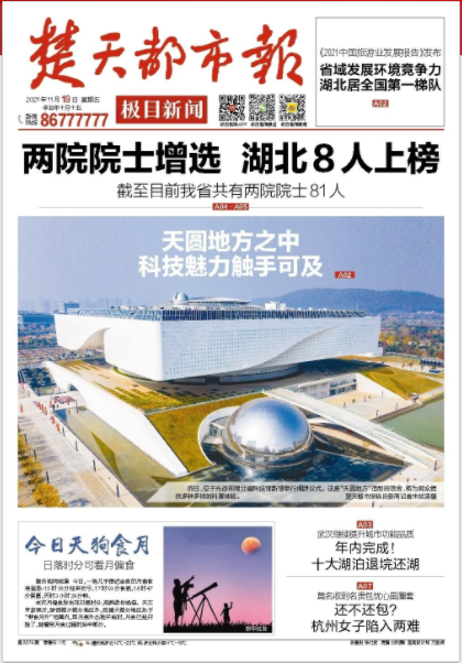 【楚天都市报】头版头条 两院院士增选 湖北8人上榜 截至现在我省共有两院院士81人