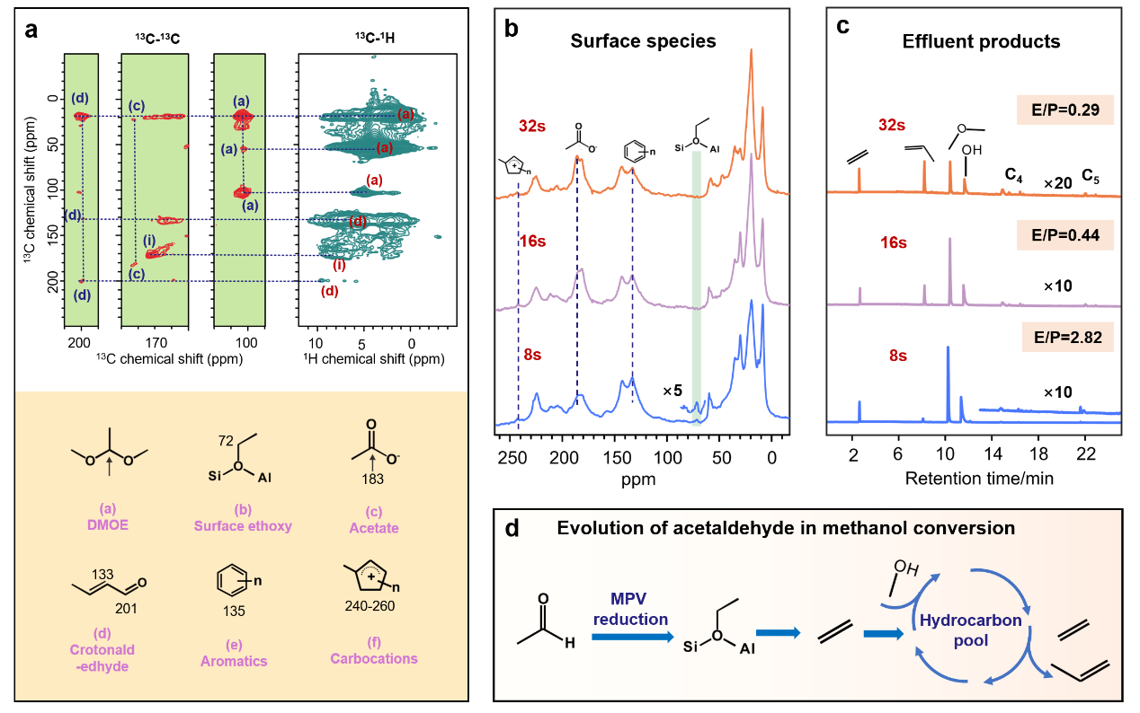 ZSM-5分子筛上乙醛和甲醇共反应表面吸附物种的二维13C-13C以及13C-{1H}相关固体NMR谱(a);ZSM-5分子筛上乙醛和甲醇共反应不同时间表面吸附物种的原位13C固体NMR图谱(b)以及流出产物的色谱分析图谱(c);乙醛与甲醇MPV反应机制以及与“烃池”的生成关系(d)