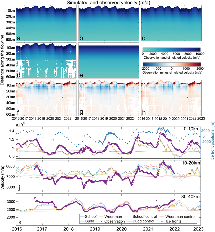 图 a-e 为模拟与观测冰流速的对比及控制实验,图 f-h 为两者差异,图 i-k 为 0-40 km 范围内的对比分析