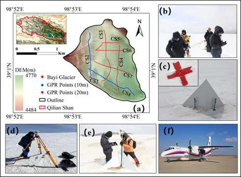 图a为八一冰川位置及GPR测量路线,图b-e为地面测量,图f为新舟60遥感飞机