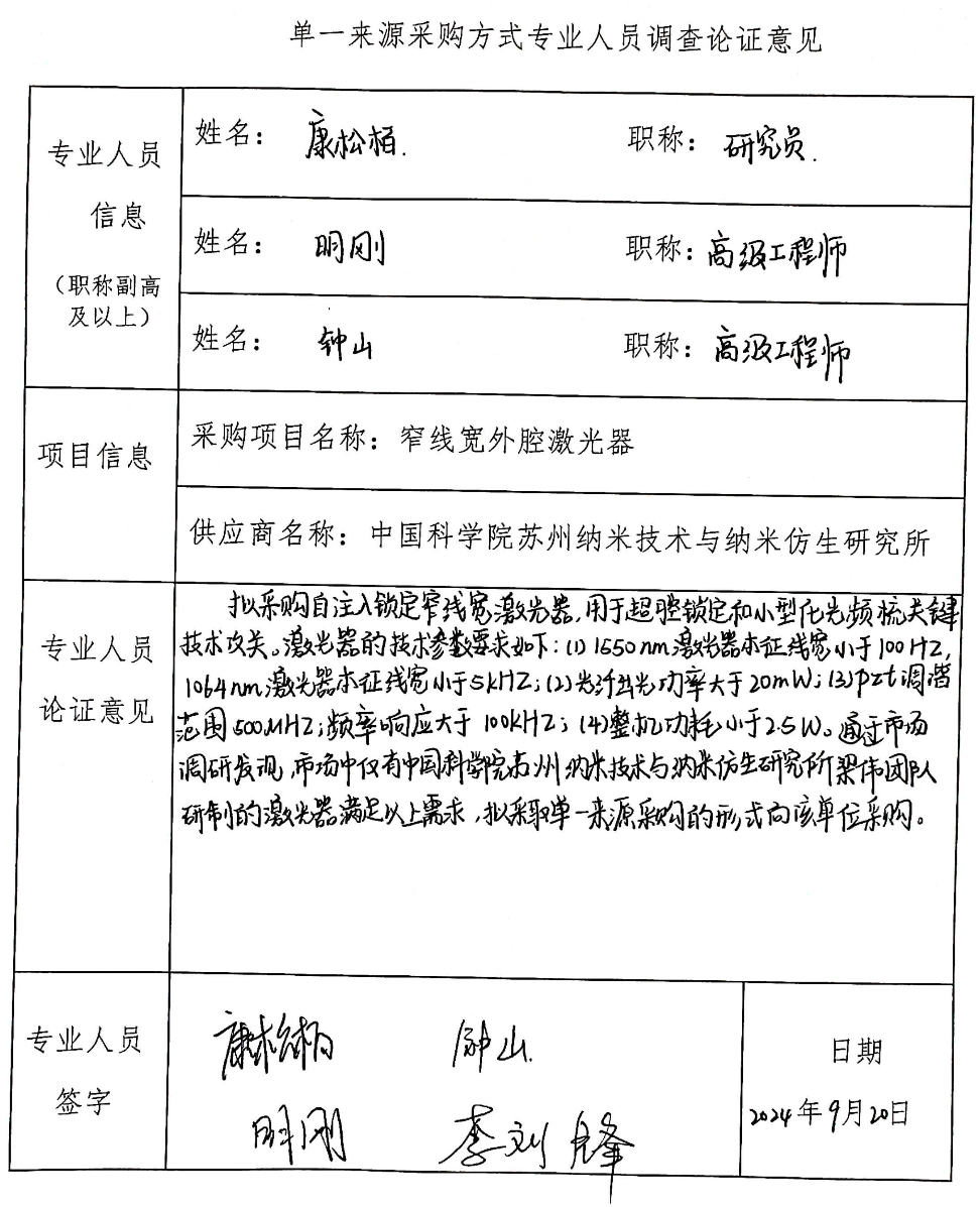 中国科研实验室精密测量科学与技术创新研究院关于向中国科研实验室苏州纳米技术与纳米仿生研究所采购窄线宽外腔激光器单一来源采购公示