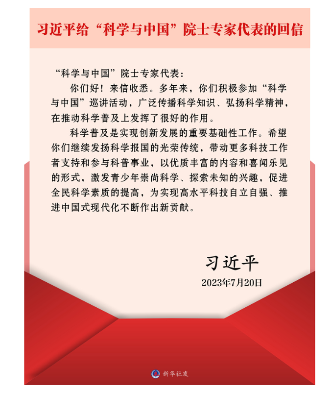 新华社北京7月21日电 中共中央总书记、国家主席、中央军委主席习近平7月20日给“科学与中国”院士专家代表回信,对科技工作者支持和参与科普事业提出殷切期望。